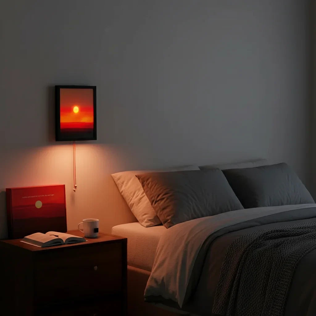 İpi çektiğiniz anda şafak simülasyonu başlar: kızıl gökyüzü yumuşak, gün ışığı LED ışıltısı ile odayı doldurur. Uyumadan önce sakinleşmek, meditasyon ve gece lambası olarak kullanmak için ideal.